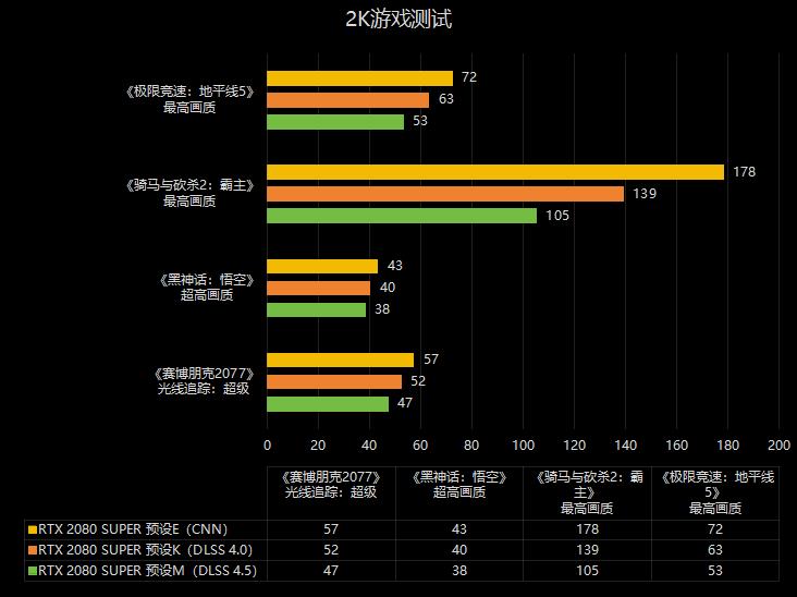 4K分辨率我们只测试了RTX 2080 SUPER显卡,在《赛博朋克2077》中,DLSS 4.5的帧率比CNN模型高约16%,《黑神话:悟空》和CNN模型持平。另外两款游戏的平均帧率分别下降了约33%和18%。