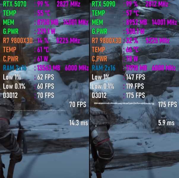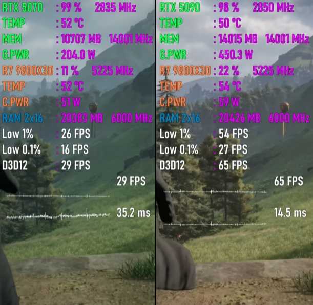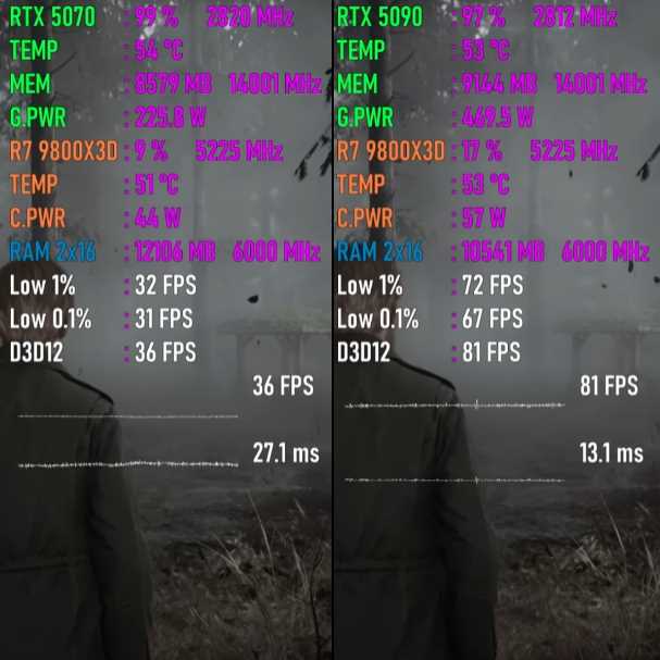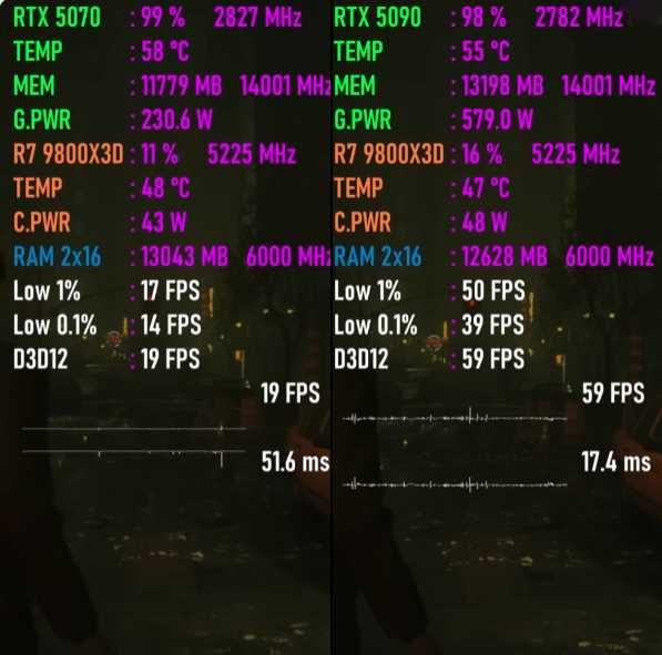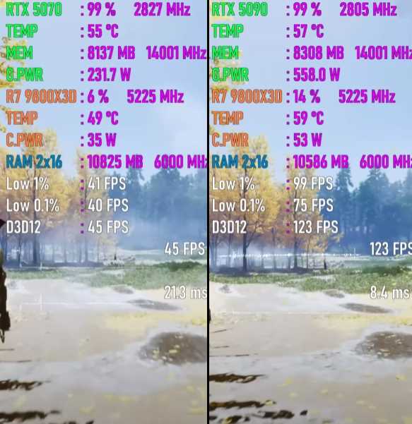 以下将分别测试七款游戏,均采用4K画质模式,以下系列图片中左边代表GeForce RTX 5070平台,右边代表GeForce RTX 5090平台。