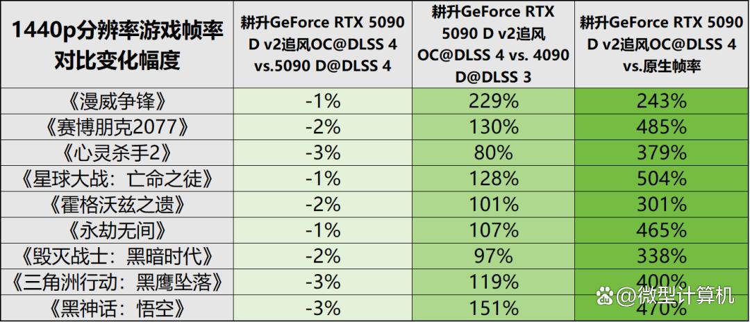 即便是在1440p分辨率下,将耕升GeForce RTX 5090 D v2追风OC开启DLSS 4后的帧率成绩,与RTX 4090 D开启 DLSS 3后的帧率成绩对比,二者差距也仍旧十分明显。以《三角洲行动:黑鹰坠落》为例,前者帧率达到400fps,后者仅为183fps,帧率提升幅度超100%;在本次测试涉及的其余游戏中,耕升GeForce RTX 5090 D v2追风OC亦能够保持遥遥领先,平均领先幅度达126%。
