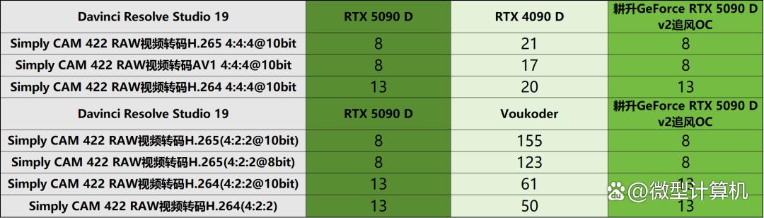 由于支持4:2:2专业格式转码,并且在编解码器数量方面与RTX 5090 D相当,因此耕升GeForce RTX 5090 D v2追风OC在这部分测试中与RTX 5090 D非常接近,并且相比软件转码,能够极大地压缩时间成本,这一优势是RTX 4090 D不具备的。除此之外,在常规的4:2:2视频转码方面,耕升GeForce RTX 5090 D v2追风OC也能够明显领先RTX 4090 D,可帮助视频创作者节约更多时间。