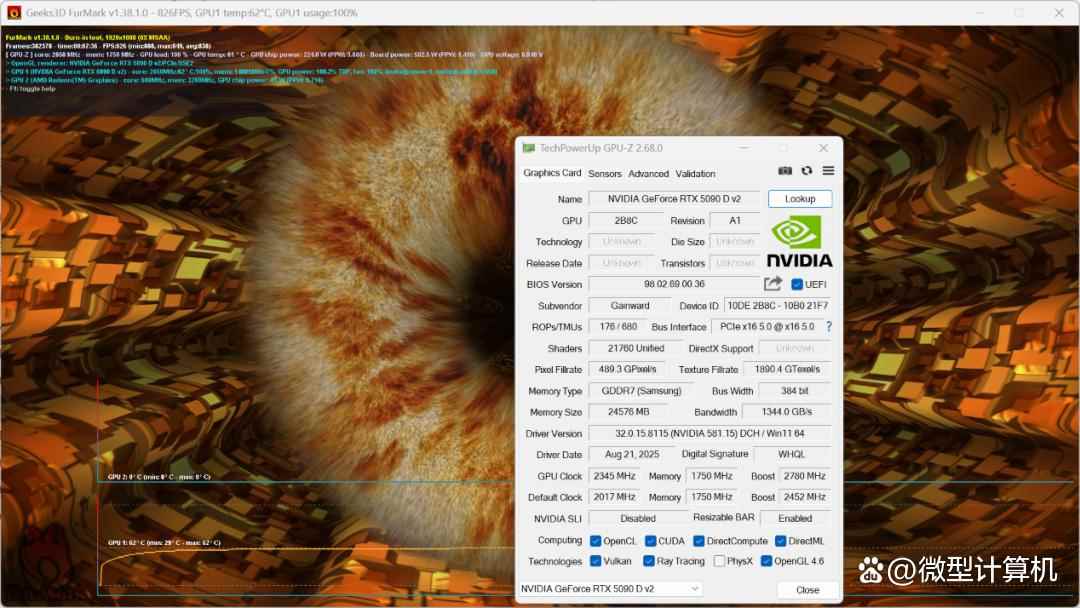 另外,我们在将核心Boost频率稳定在2780MHz+风扇全速的状态下完成了Furmark测试,并且核心温度能够稳定在62℃,较超频前温度进一步下探了10℃,其全速状态下的散热效率不错。