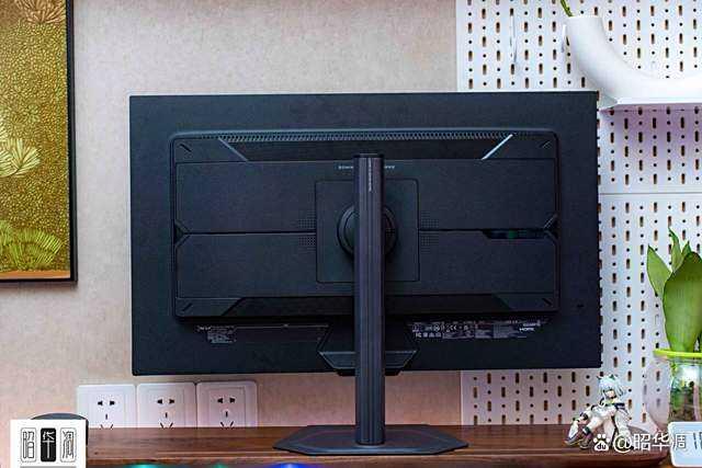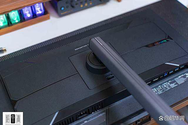 ▼显示器的背面设计采用了类似“背包”的构造,其凸起部分主要是为了容纳电路板、电源等组件,不用拖着那个砖头大的“尿袋”,顶部则是散热栅格!整机虽然不是那种薄如蝉翼的类型,但边缘收得非常漂亮,哑光磨砂的背壳手感不错,右侧还有个 GAMING 镭射铭牌。