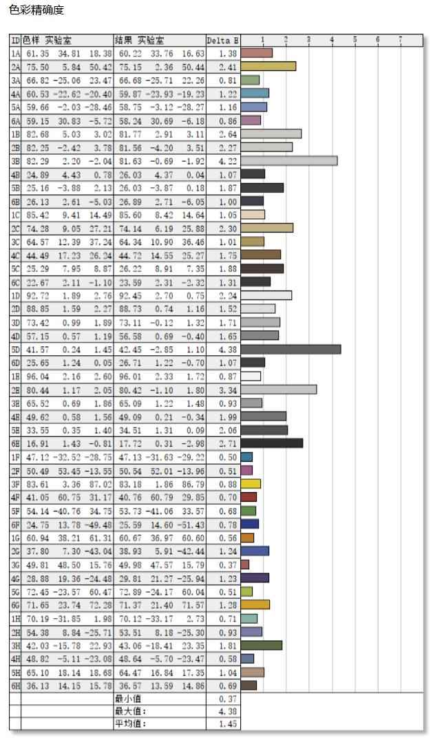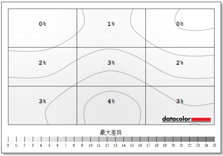 接下来,我们使用Spyder X2 Ultra校色仪,对它进行分析,测试前我们将显示器恢复出厂设置。从测试结果来看,在默认模式下,显示器拥有100% sRGB、98% DCI-P3以及95% Adobe RGB的色域覆盖,与官方参数相符。色准方面,我们采用了48色方案的色彩精准度测试,测出显示器的Delta E平均值仅1.45,不同区域的色差Delta E最大值不过相差2,色准表现非常优秀。同时在100%亮度下,屏幕右上方和正下方的亮度差别最大,差距也不过4%,表明其屏幕的均匀性表现非常出色。