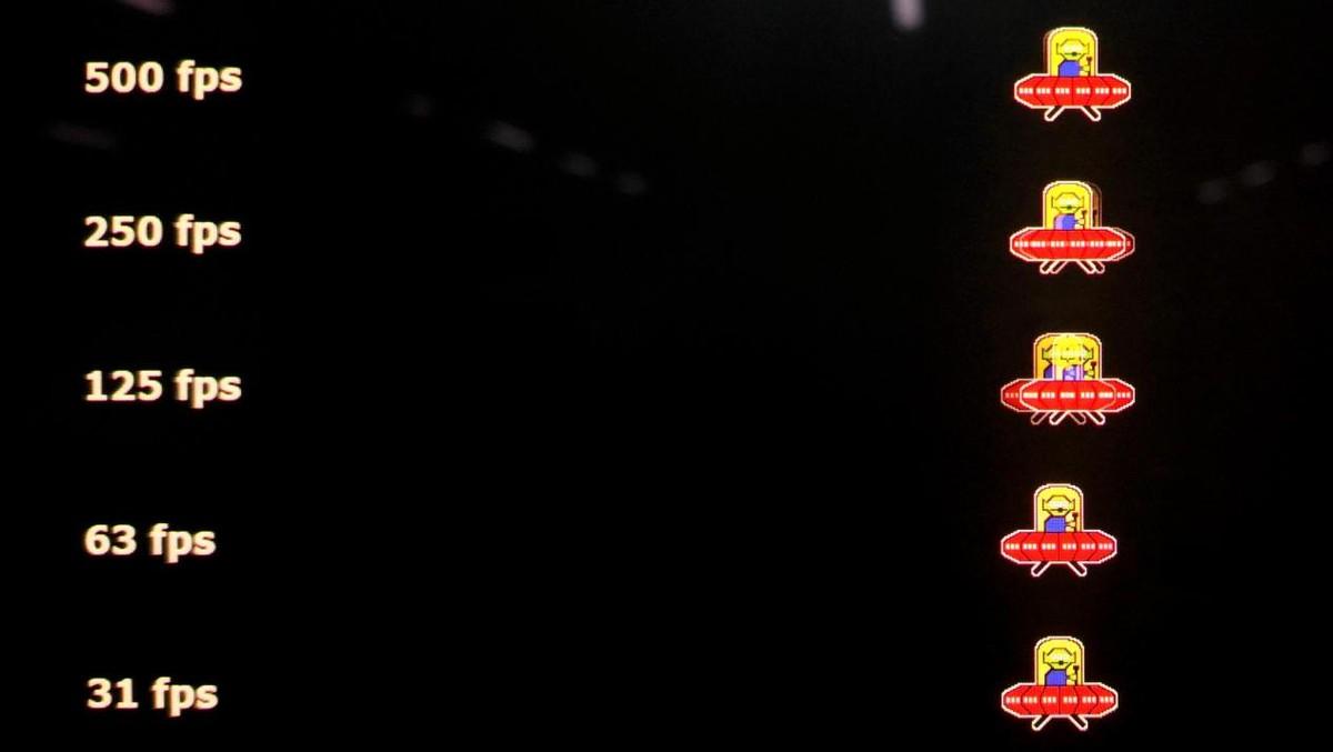 我们用UFO TEST测试屏幕的刷新率,在刷新率测试中,显示屏幕刷新率一直刷定在500Hz,表明屏幕参数并无虚标,说明其支持500Hz输出。由于屏幕还有0.03ms GTG响应时间的优势,可以看到其在屏幕响应测试中表现堪称完美,500Hz下快速运动的UFO最为清晰和连贯,通过相机抓拍的情况来看,完全没有任何拖影和模糊的现象,而且500Hz下UFO图像运动的速度也更快。