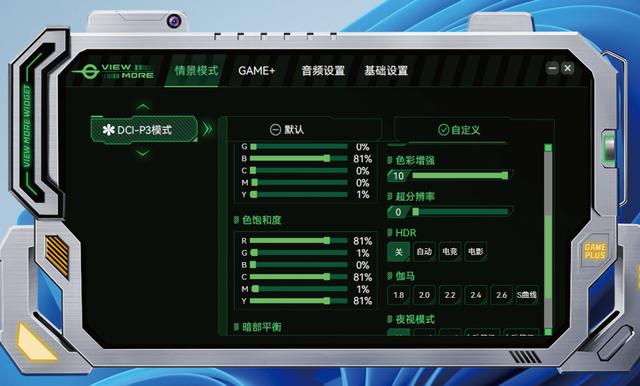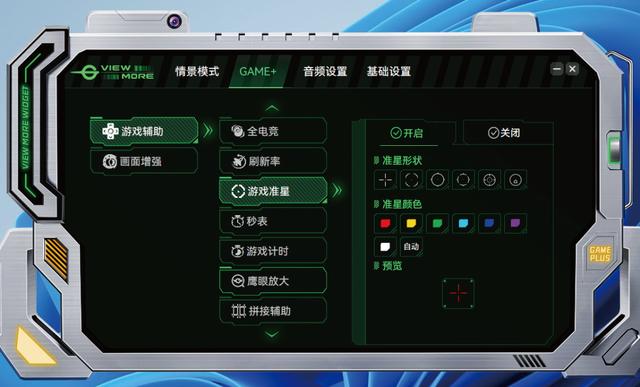 泰坦军团G27W8S还支持VIEW MORE WIDGET软件,软件界面颇具科技感,通过该软件能够更加直观地对显示器的各项功能进行调节。该软件有4大功能模块,可对情景设置、GAME+、音频设置以及基础设置进行调节。比如在“情景模式”中,可以快速选择相应的模式,并且针对该模式可以直接拖动数值条调节,非常方便。同时,在“GAME+”中,还可以通过该软件让显示器显示刷新频率、计时器、准星的样式进行自定义等。同时还能实时预览功能显示效果,比OSD菜单调节更加直观。
