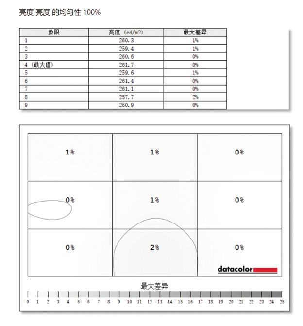 ▲该显示器的亮度最大值为261.7cd/㎡,面板均匀性差异最大仅2%,亮度均匀性表现出色。