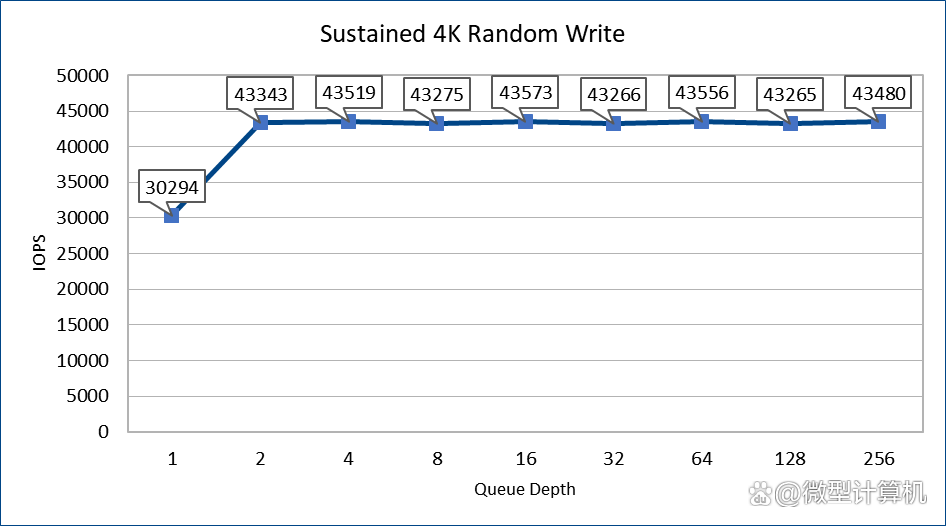 稳态随机4K写入测试中,只需在QD2下,SE006企业级SATA固态硬盘960GB就可释放出最大随机写入性能,达到43K IOPS。虽然在稳态下的随机4K写入性能与FOB状态下差距较大,但其43K IOPS的性能表现依然小幅超过标称的40K IOPS随机写入性能指标。更值得一提的是,在QD1下,SE006企业级SATA固态硬盘960GB的随机4K写入延迟只有32.85μs,大幅低于标称的40μs,实际表现同样优于标称技术规格。