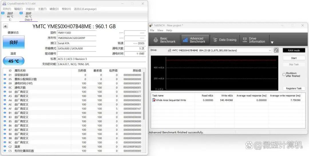 ▲SE006企业级SATA固态硬盘960GB的全盘平均顺序写入速度高达540.49MB/s,完成全盘写入后的温度仅45℃。