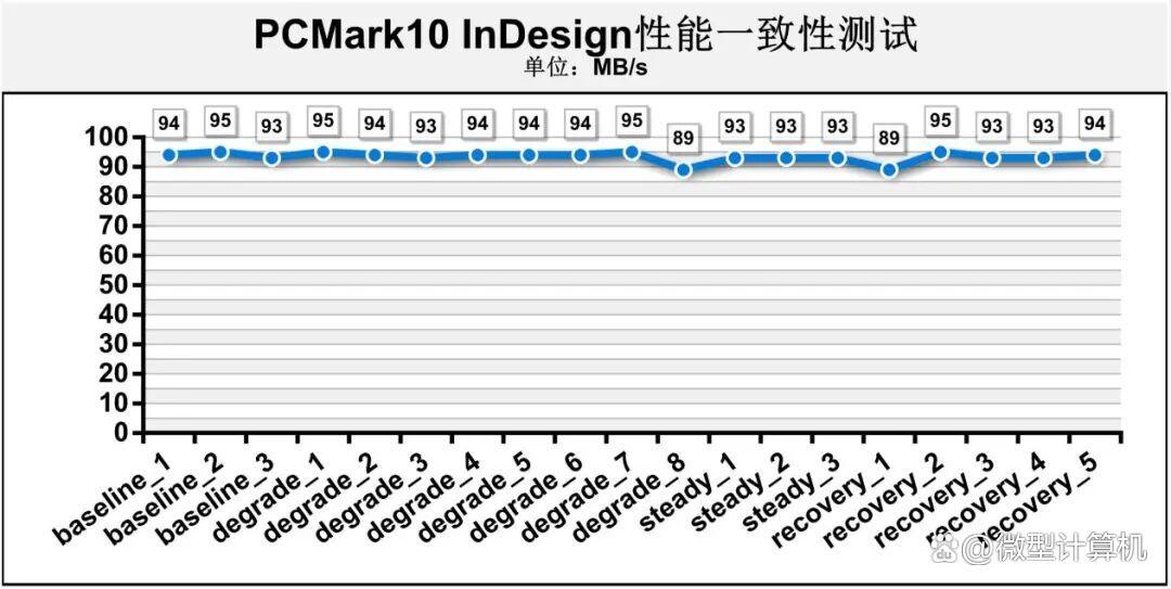 在InDesign测试中,固态硬盘的最高传输速度为95MB/s,最低传输速度为89MB/s,降级阶段、稳定态的很多测试点传输速度也能达到90MB/s以上,最大波动幅度不到7%。