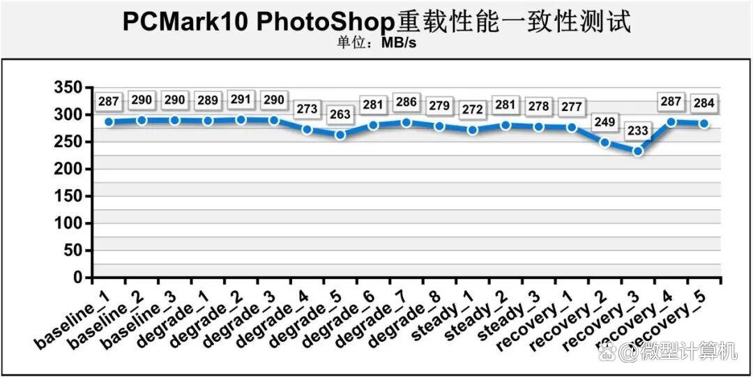Photoshop重负载测试中,固态硬盘在初始阶段的传输速度为287MB/s~290MB/s,在稳态下的速度能达到272MB/s~281MB/s,下降幅度不大。更值得一提的是,在恢复阶段,经过两次波动后,SE006企业级SATA固态硬盘960GB的速度就能迅速恢复到284MB/s~287MB/s,接近初始性能。