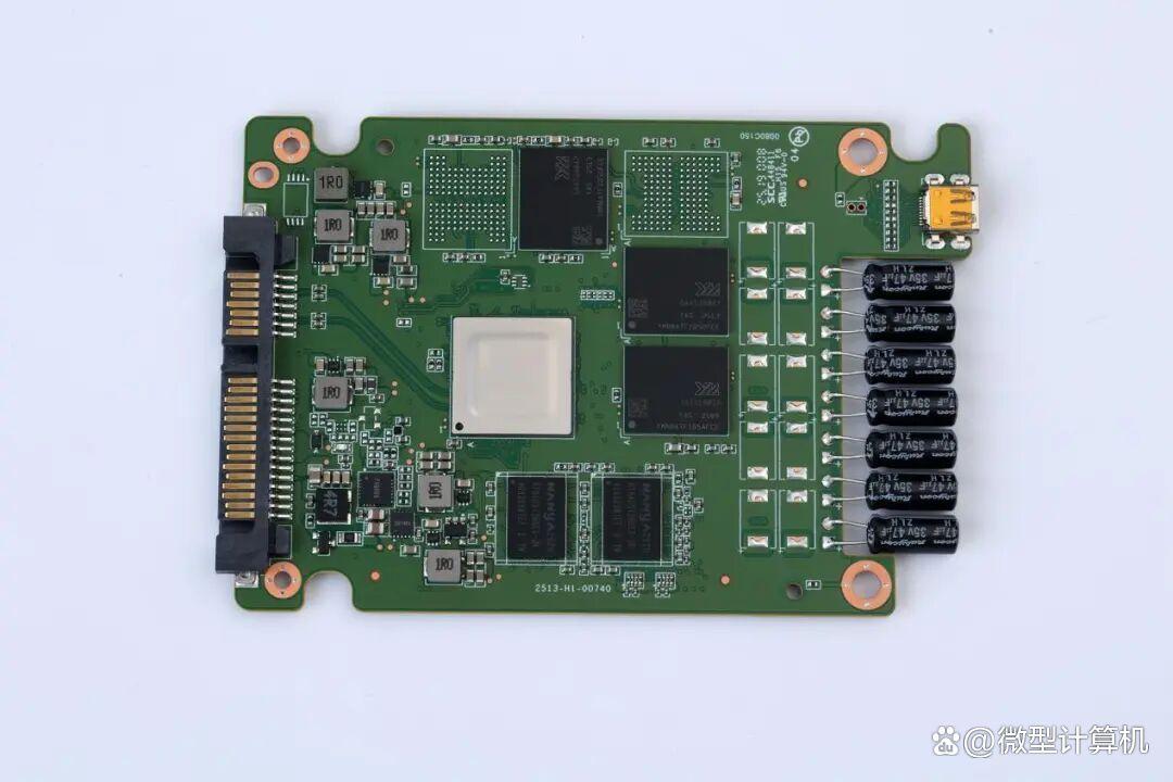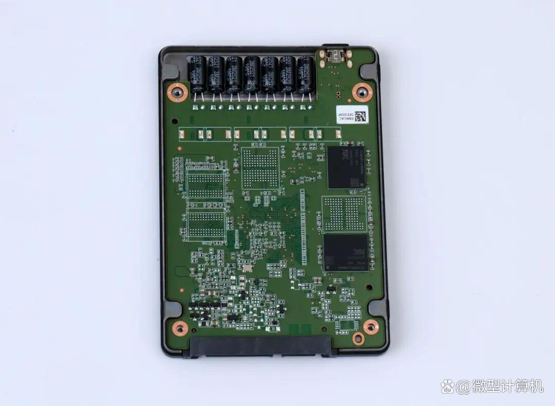 从外观看,长江存储SE006企业级SATA固态硬盘与普通的SATA产品相比,没有明显区别——传统的长方形外壳,搭配7mm厚度设计,可以适配服务器与消费级PC使用。不过当我们打开其960GB产品的内部,可以看出这款产品与消费级SATA固态硬盘的不同。其PCB顶部配备了多达7颗聚酯薄膜电容,印在电容上的“105℃”意味着这款电容的最高工作温度可达105℃,每颗电容的容量为47μF。在SSD遭遇突发断电的情况下,能提供冗余电量保护缓存中的映射表和临时数据,将其写回到闪存中,避免数据丢失。根据长江存储官方数据,SE006企业级SATA固态硬盘通过了超过7000次异常掉电循环测试。这意味着当服务器遭遇临时停电,也不会损坏系统盘,确保服务器的工作稳定性。
