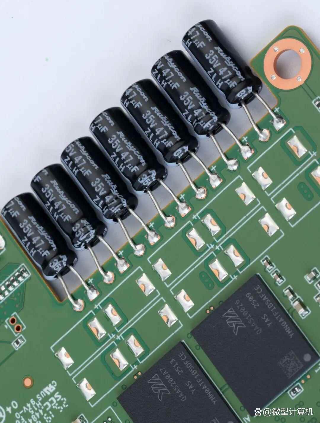 ▲打开外壳,可以看到这款产品最大的不同在于它配备了7颗能在最高105℃下工作的电容,可以避免掉电损坏数据。