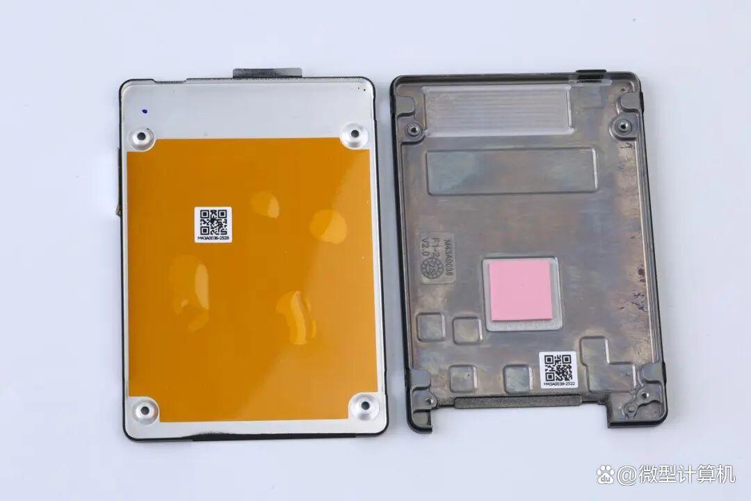 ▲固态硬盘的外壳贴有一层屏蔽膜,以及一块为主控芯片设计的导热垫。