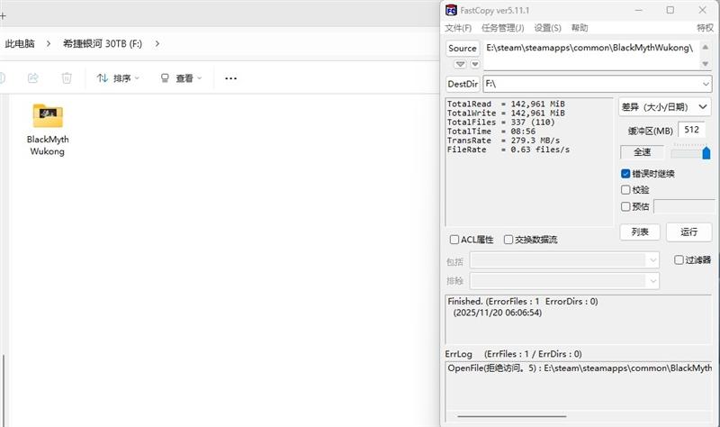 我们从本地SSD中将《黑神话:悟空》拷贝至银河30TB,文件大小142GB,共3357文件。