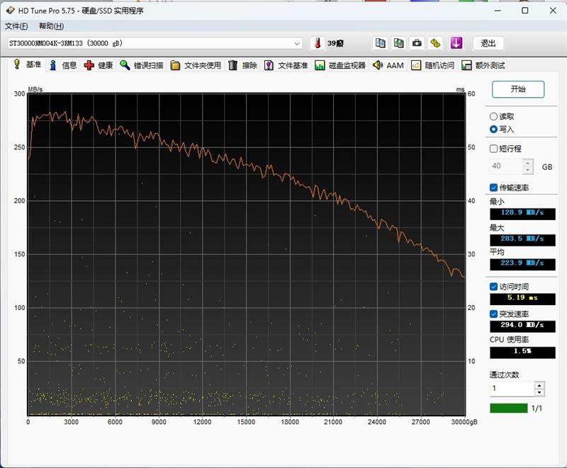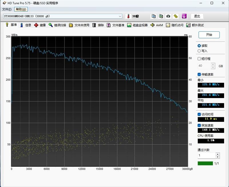 希捷银河30TB外圈顺序读取速度为279MB/s、中圈顺序读取速度227MB/s、内圈顺序读取速度121MB/s。