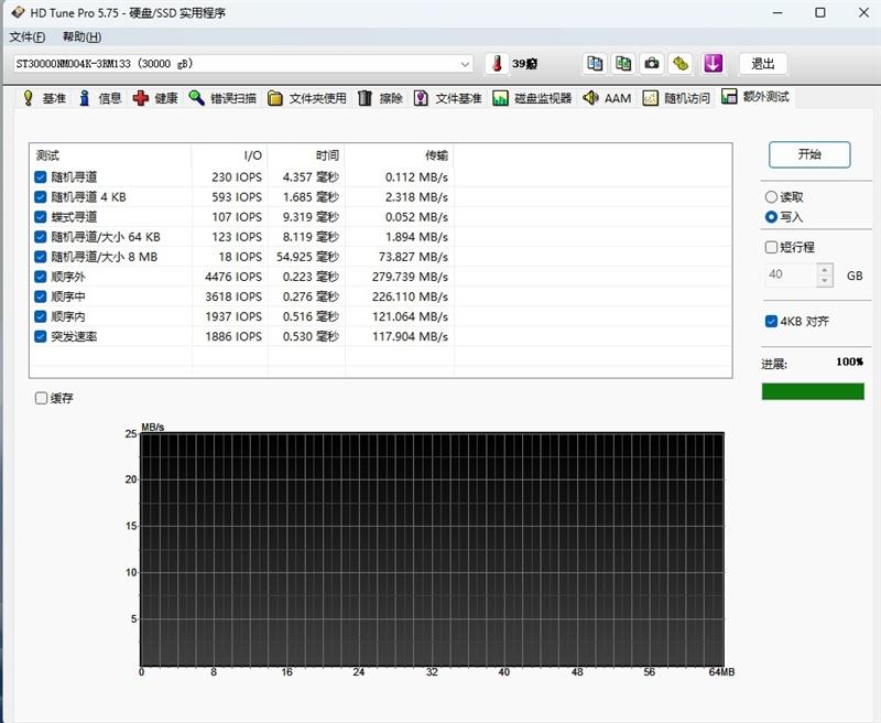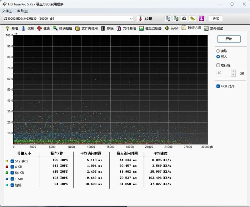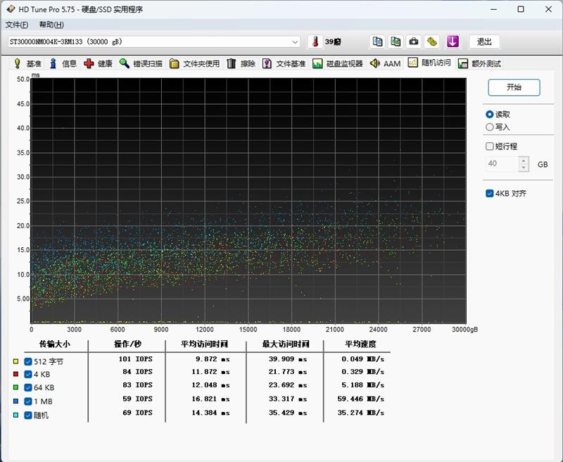 在低于64KB的小文件测试中,希捷银河30TB的每秒进行读写(I/O)操作约为83 IOPS,对于特别小的文件,比如512Byte的超小文件,读取速度为0.049MB/s,平均访问延迟9.8ms。