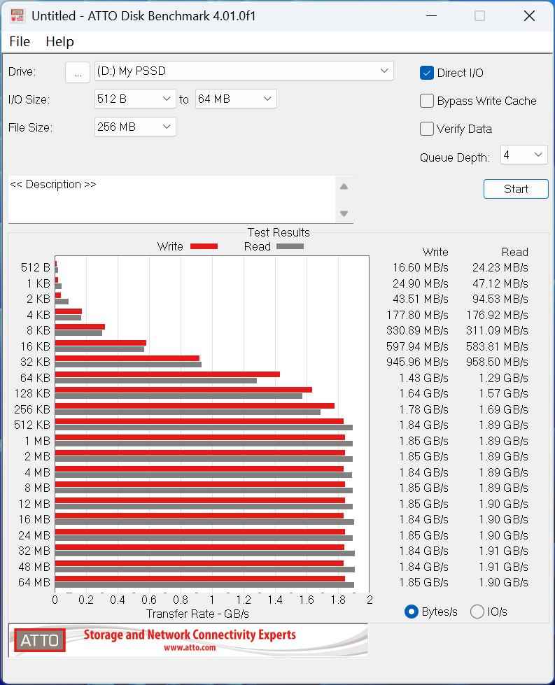 其次是ATTO Disk Benchmark,可以看到其最高持续读取、写入性能基本维持在1.9GB/s、1.85GB/s,速度表现同样非常出色。而且从512KB开始,速度基本保持不变,非常稳定。