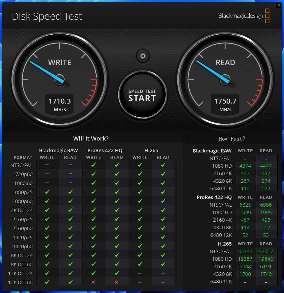 再次是Disk Speed Test测试,该测试能体现其在视频传输方面的性能。从结果来看,持续写入速度为1710.3MB/s、持续读取速度为1750.7MB/s,表现亮眼。视频支持方面可以覆盖8K视频的读写需求、12K视频部分格式的读写需求,满足非专业级的视频创作没有问题。