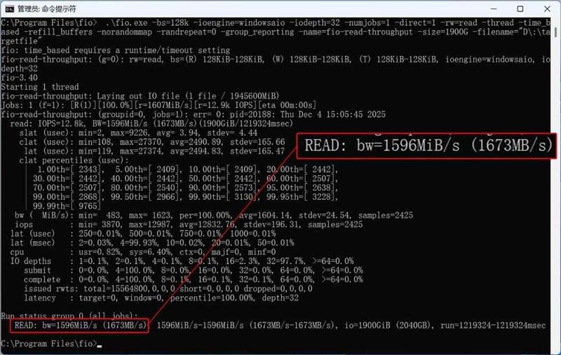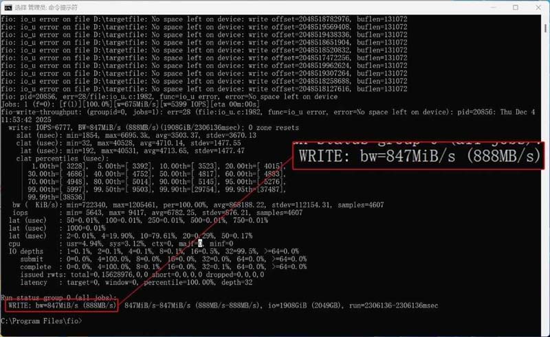 我们进一步探索了致态灵·潮流版移动固态硬盘的极限性能。使用fio进行了全盘读写测试,bs=128K,IO深度为32,其中写入数据量为1908GiB(2049GB),读取数据量为1900GiB(2040GB)。