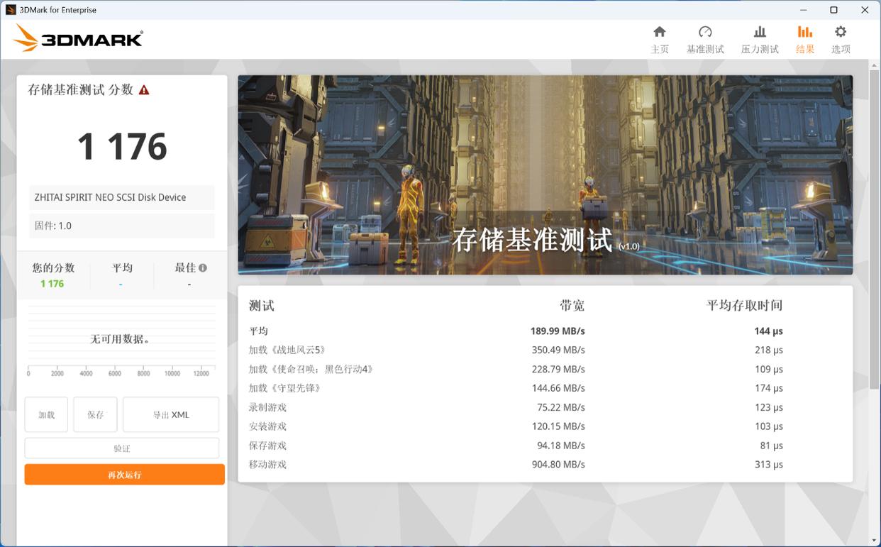 首先是3DMARK存储基准测试,最终得到的分数为1176分,表现优秀。测试也详细罗列了其在具体游戏中的带宽表现,可以看到加载游戏的平均值基本在220MB/s左右,这一点与前面的PCMARK10数据盘基准测试基本保持一致。而在更看重持续读写性能的移动游戏部分则是904.8MB/s,考虑到游戏文件较多,且大小不一,如此传输速度已经非常优秀了。