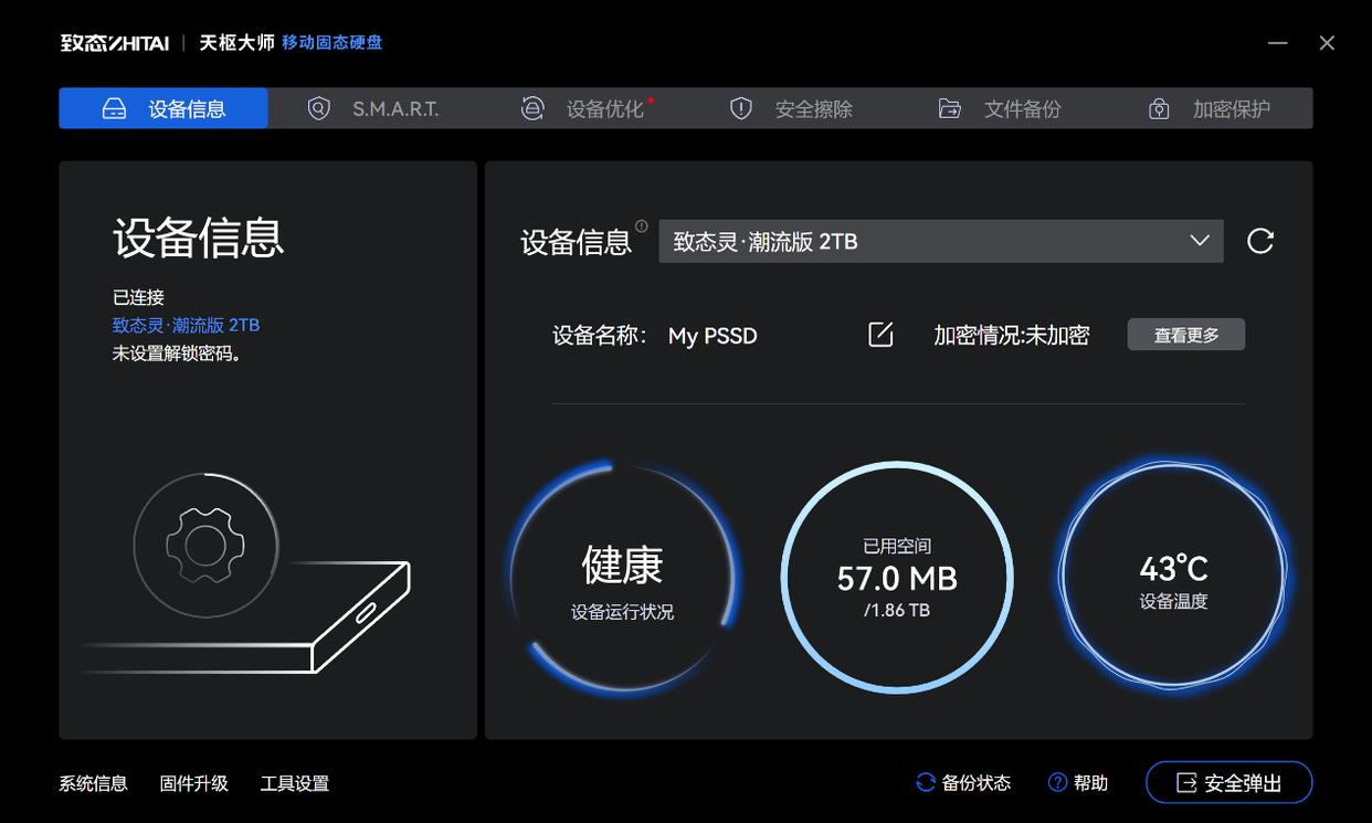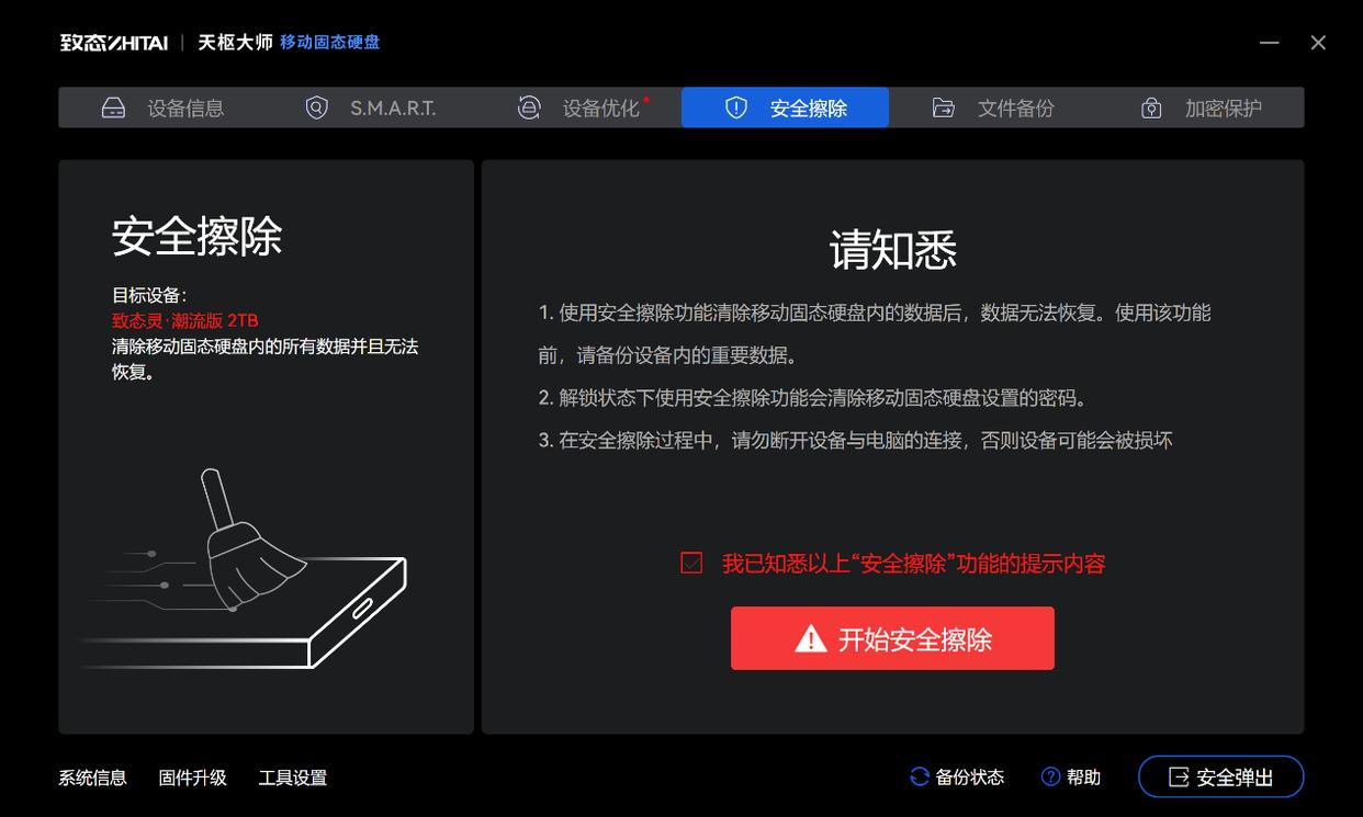 致态天枢大师移动固态硬盘的功能非常丰富,用户不仅可以看到移动固态硬盘的设备状态,包括健康度、已用空间、加密状态、S.M.A.R.T.信息,同时还提供了固件升级、设备优化、安全擦除、文件备份等功能,特别是安全擦除和文件备份功能,对于存储重要数据的用户来说非常方便。