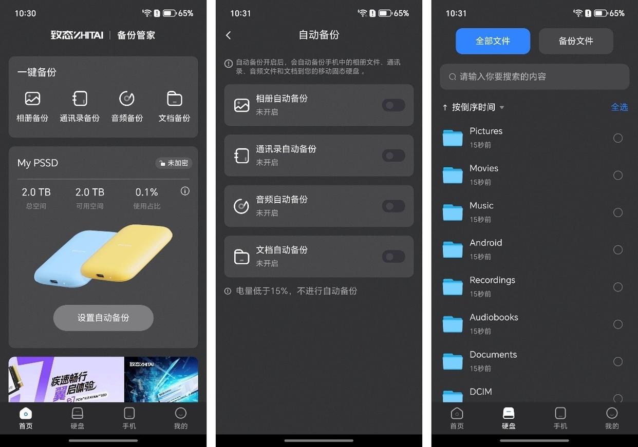 软件生态方面,致态提供了致态天枢大师移动固态硬盘(Win桌面应用)、致态加密软件(Win桌面应用)以及致态备份管家(支持安卓和鸿蒙设备),方便用户管理数据,了解致态灵·潮流版移动固态硬盘的状态。
