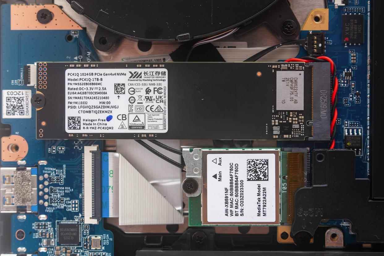 机械革命骁龙16 Pro使用全新冰霜散热架构,搭载2x冰鲨风扇+翼型环流鳍片。存储方面配置有两个带有金属散热片的M.2插槽,预装有长江存储PC41Q 1TB固态硬盘的硬盘位上方还布置了导热贴,进一步增强了SSD的散热能力。再加上长江存储PC41Q本身功耗就不高,所以即便是进行压力测试,温度也不会很高。