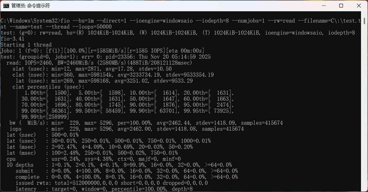 然后利用fio,将这个文件反复读取5万次,以模拟非常极端的“扫盘”情况。