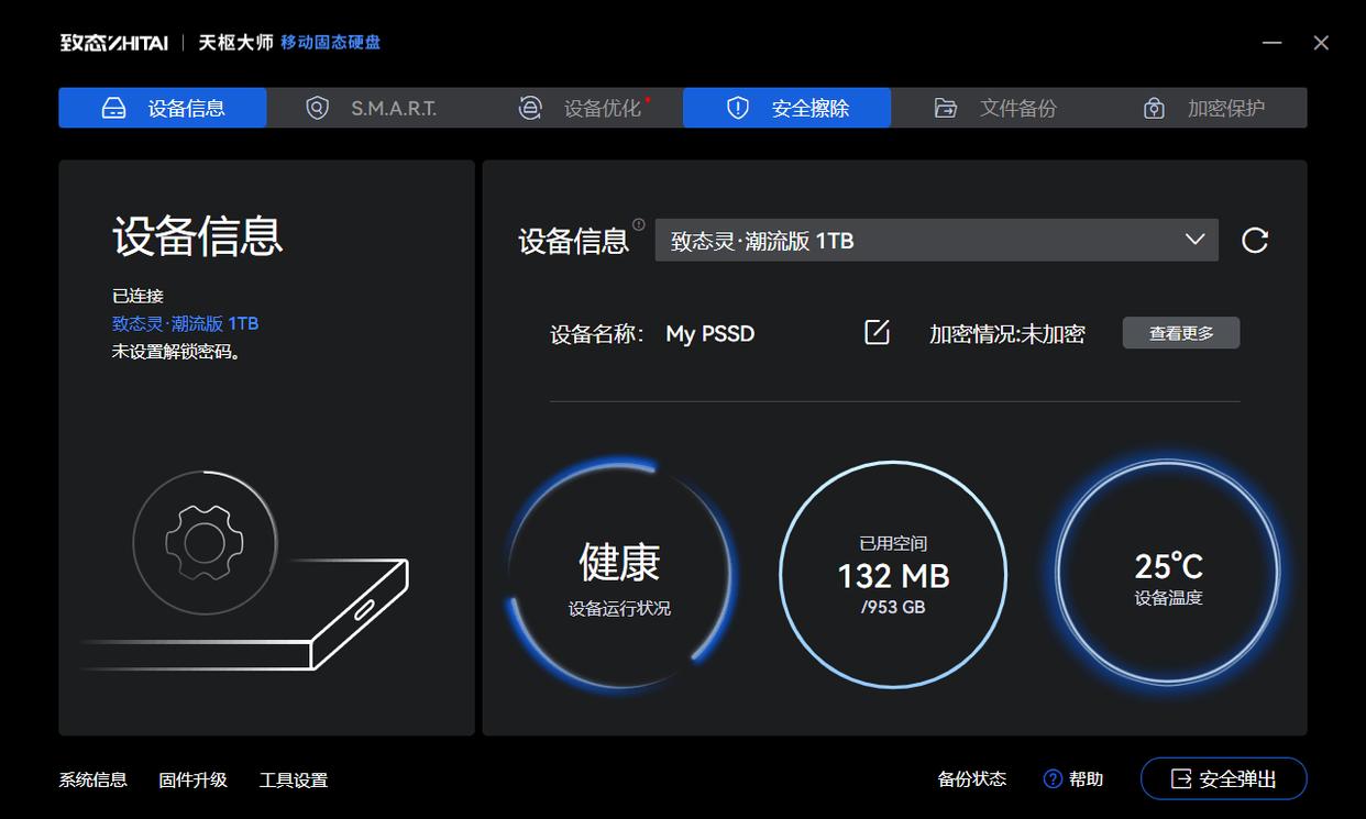 致态灵·潮流版在文件夹中随机附带了自家的加密软件,还可以下载Windows端的致态天枢大师移动固态硬盘管理软件和Android端的致态备份管家来实现固件升级、设备优化、安全擦除和文件备份等更多功能。