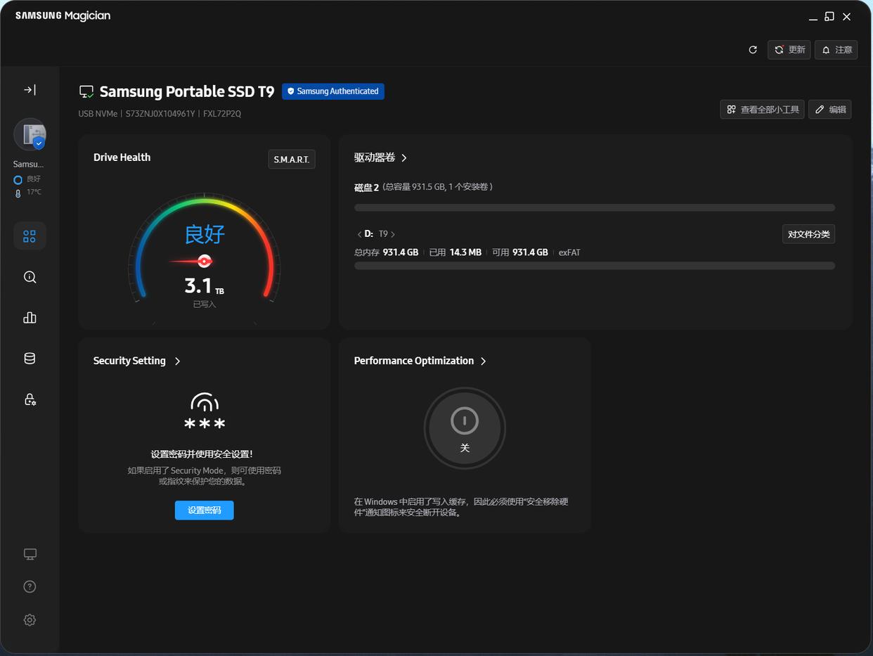 三星T9同样默认为exFAT格式,实际可用容量为931GiB,可以搭配三星魔术师来实现更多控制选项,只是需要自己手动下载: