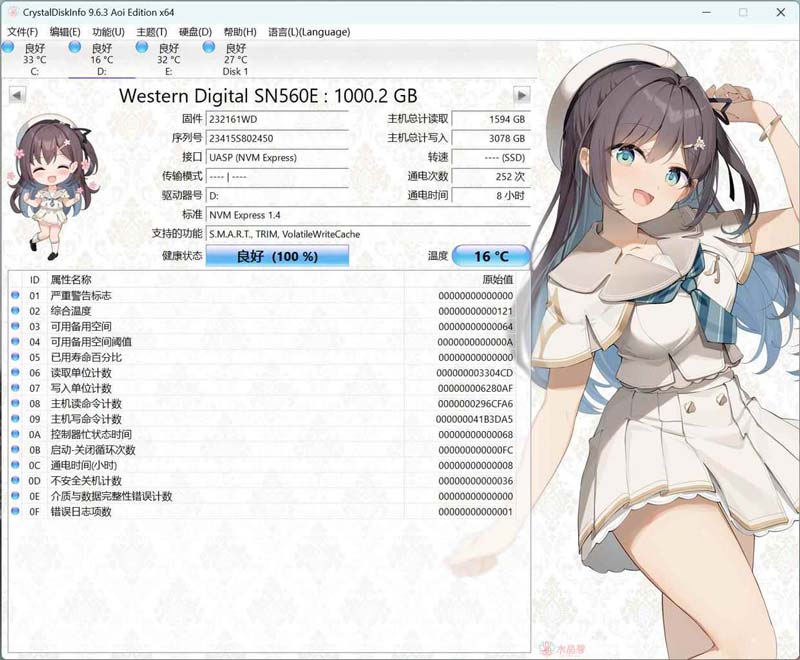 打开Hwinfo64软件,通过读取S.M.A.R.T信息之类的管理命令将PSSD唤醒后,PSSD会从待机休眠状态瞬间切换回活跃空闲状态,此时NAND闪存颗粒可能不需要大量工作,但是主控芯片会热身活动起来,时刻准备着接受操作,功耗也要比待机状态下略高一些。