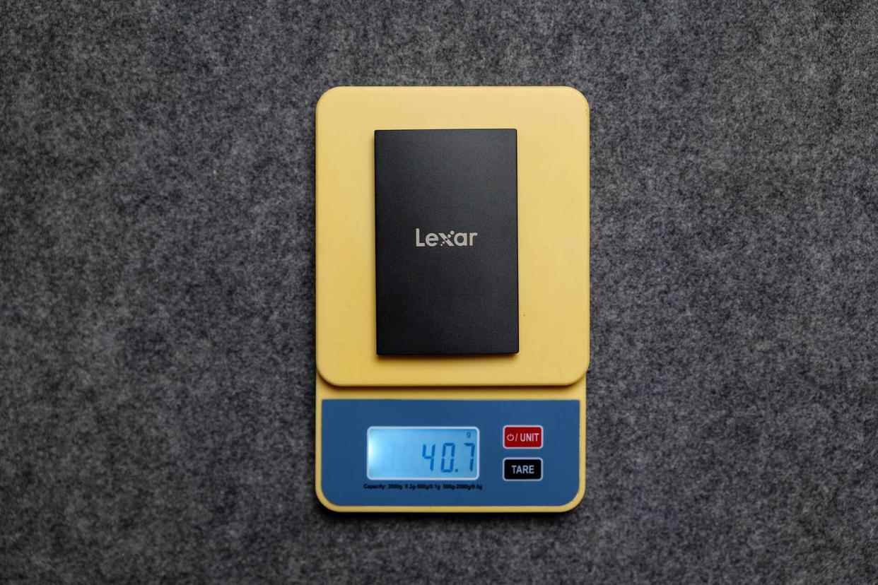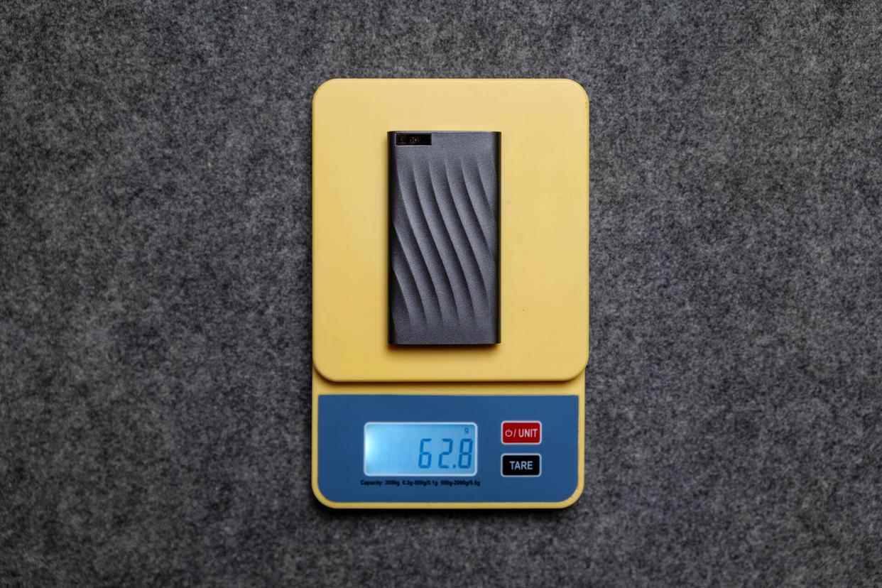 实测西数P40的重量大约为76.9g,竟然比体积更小的三星T9更轻,这一点倒是做得不错: