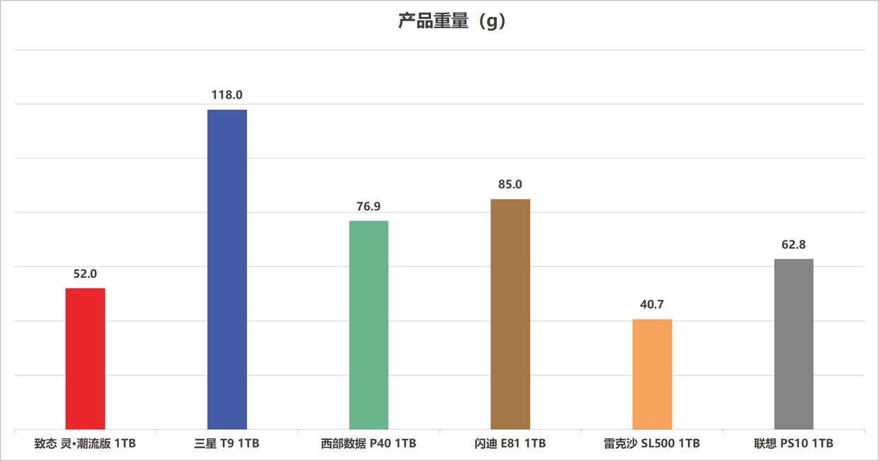 6款产品中,三星T9、西数P40和闪迪E81均采用了桥接芯片+NVMe SSD的方案,这不仅会导致功耗更高,而且在轻量化方面也不如其他3款采用原生主控方案的国产PSSD有优势,后者在体积与重量控制上优势明显,便携性更佳。