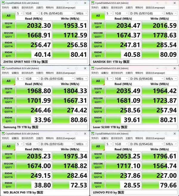 在将6款SSD格式化为NTFS格式后,使用CrystalDiskMark分别对其进行测速,结果如下图所示: