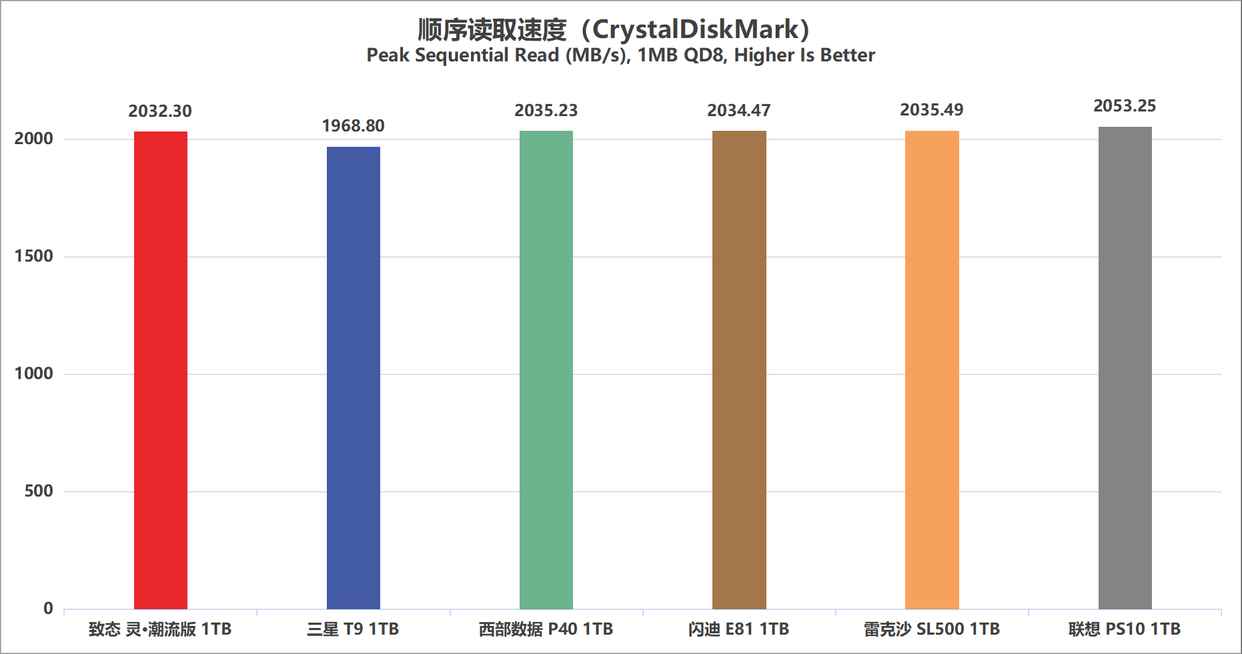 根据CrystalDiskMark的测试结果,除了三星T9以外,其他5款产品的顺序读取方面都在2000 MB/s以上,彼此之间的差异极小,基本可以视为同一水平。