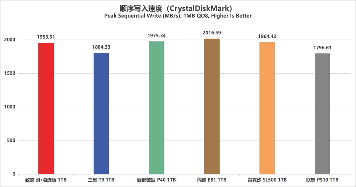 在顺序写入速度方面,闪迪E81以微弱优势取得了头名,随后致态灵·潮流版、西数P40和雷克沙SL500都在1950 MB/s以上,而三星T9和联想PS10稍微低了一点儿,维持在1800 MB/s附近。