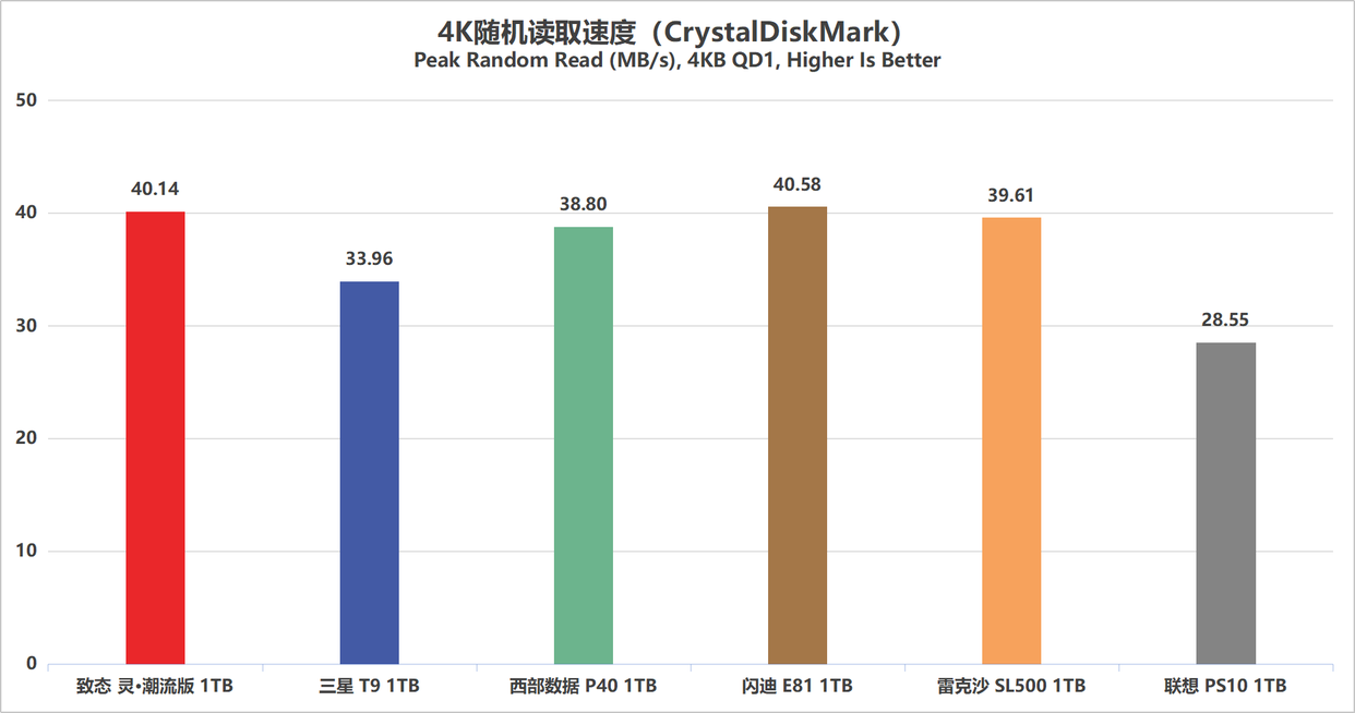 Q1T1 4K随机读写性能方面,致态灵·潮流版和闪迪E81略微超过了40 MB/s,随后西数P40、雷克沙SL500也在39 MB/s左右,三星T9和联想PS10这俩兄弟还是比其他选手明显低了些。