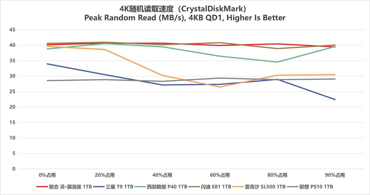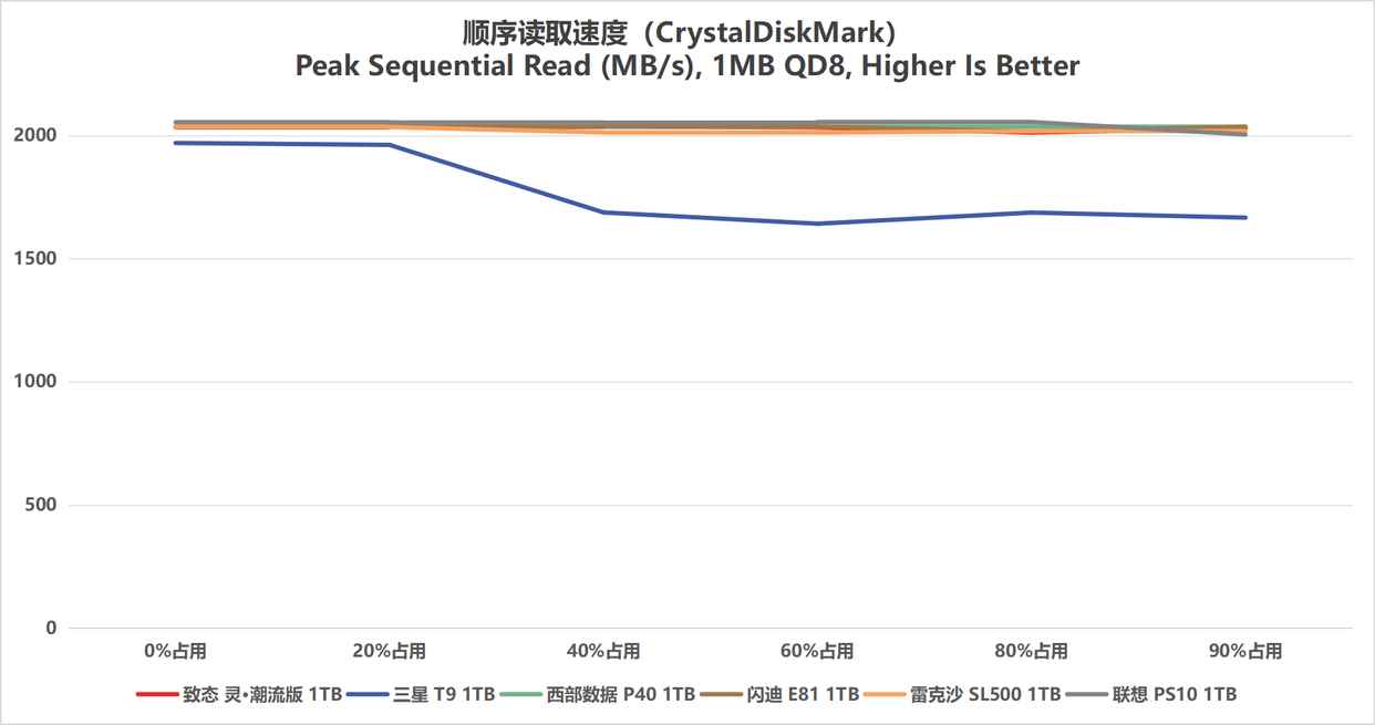 从下图中可以看到,随着占用率的提高,三星T9的顺序读取测试成绩有一个相对明显的下滑趋势,而其他5款产品大致能保持稳定: