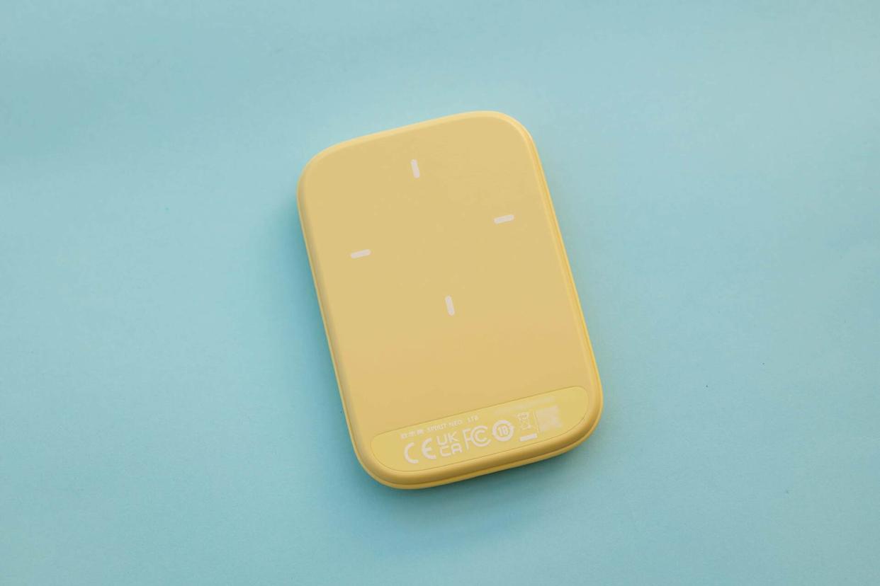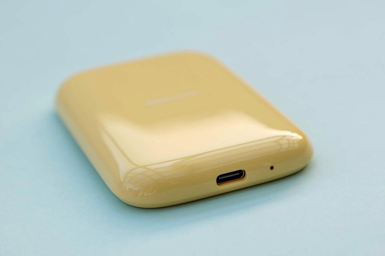 背面为磨砂塑料材质,并且有类似十字准星的定位标志,这是因为致态灵·潮流版自带磁吸功能,可以通过吸附固定在iPhone等手机背后,和手机直连传输数据。