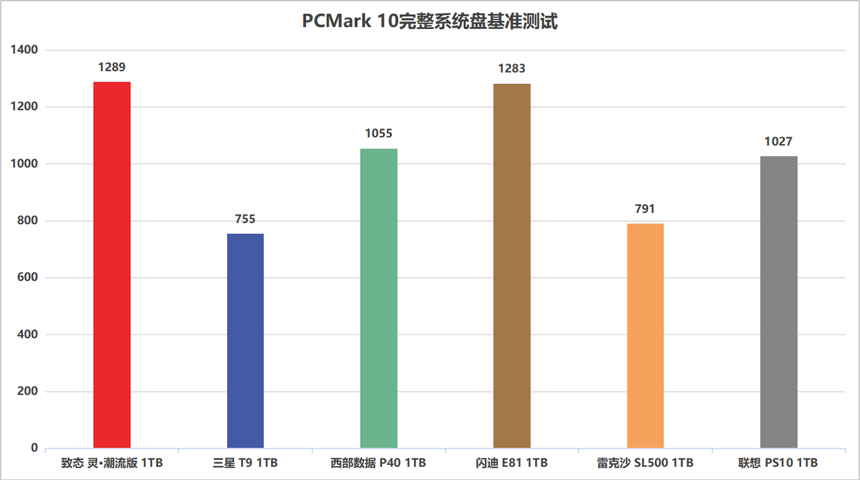接着我们使用PCMark10的完整系统盘基准测试功能,来测试6款PSSD的综合性能。