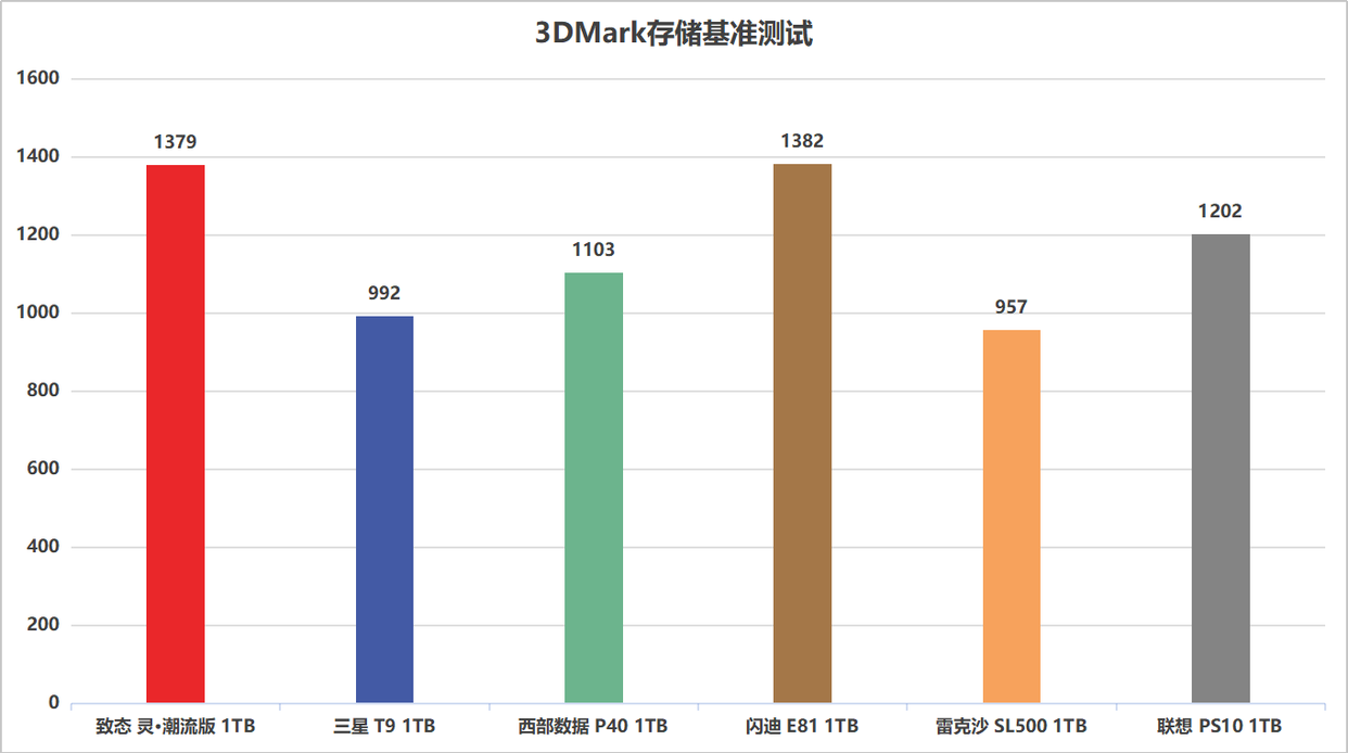 在该项测试中,致态灵·潮流版得分最高,达到了1289分,和1283分的闪迪E81非常接近;接下来西数P40和联想PS10的得分则在1000左右;而三星T9和雷克沙SL500的成绩就相对低一些,不到800分。
