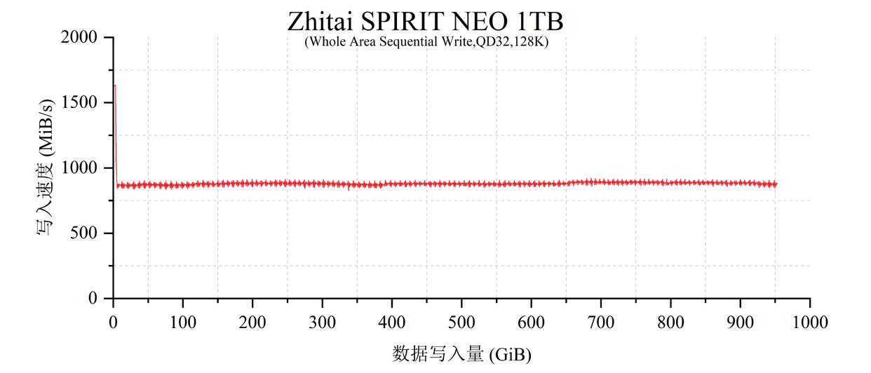 从致态灵·潮流版的写入曲线可以看得出来,曲线成二段式特征,并且其SLC Cache容量比较小,基本一写就出缓,还好在出缓后,写入曲线非常平直稳定,保持在平均879.5 MiB/s左右。