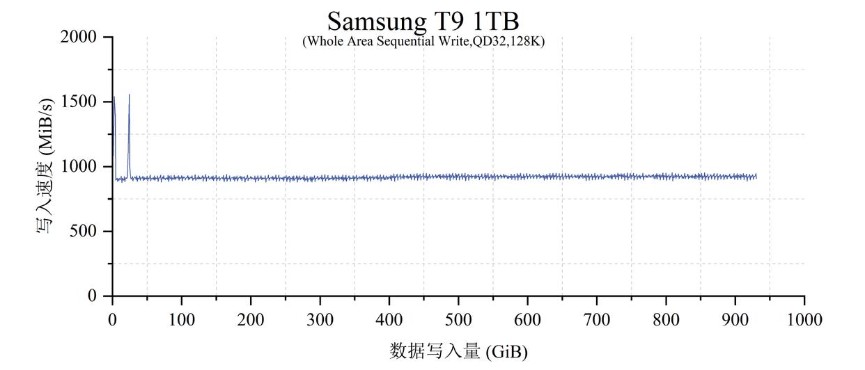 三星T9的写入曲线特征与致态灵·潮流版很相似,同样是较少的SLC Cache空间,耗尽后也基本上保持一条平滑直线,而且出缓写入速度稳定在平均917.8 MiB/s左右。
