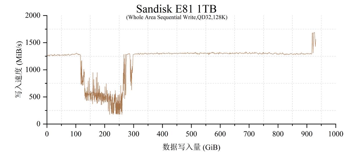 反而是闪迪E81的写入曲线中,稳定状态下的写入速度要比其他5款选手都快,就是不知道写入300 GiB之前这么大的波动到底是咋回事,以至于明显拉低了平均的写入速度。不过有一说一,它在稳定状态时的写入速度是6款盘里最快的,达到了1305.5 MiB/s。