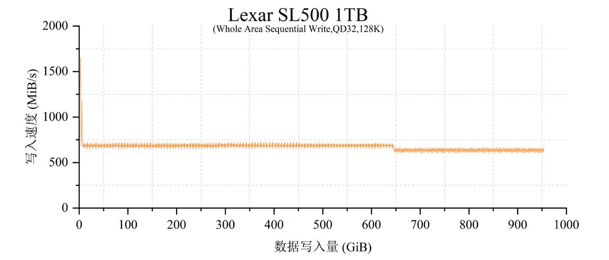 雷克沙SL500的写入曲线呈现三段式特征,同样SLC Cache较小,出缓后平均写入速度降低至686.8 MiB/s左右,第三段进一步降至635.5 MiB/s左右: