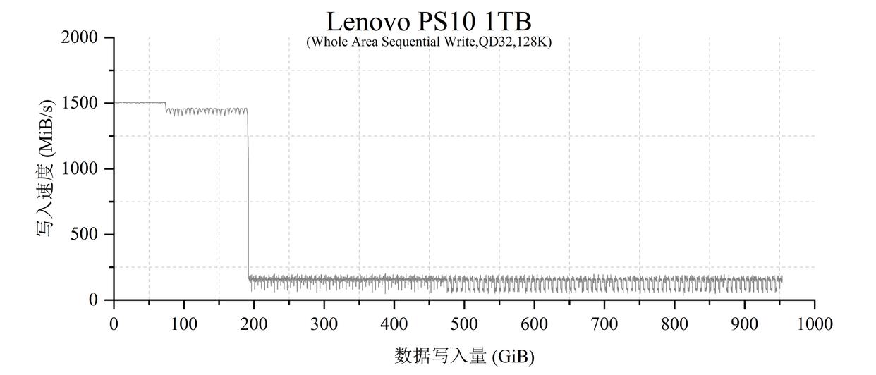 而联想PS10则在这项测试中直接暴露了QLC颗粒的底色,它凭借相当大的SLC Cache在前面的一系列测试中取得了很不错的成绩,在缓内的平均写入速度能达到1468.2 MiB/s,但当SLC Cache耗尽后,速度直线下降至136.6 MiB/s左右。对它写入一遍全盘用了将近6000s,这也是我在整个横评过程中测试得最痛苦的一位选手。