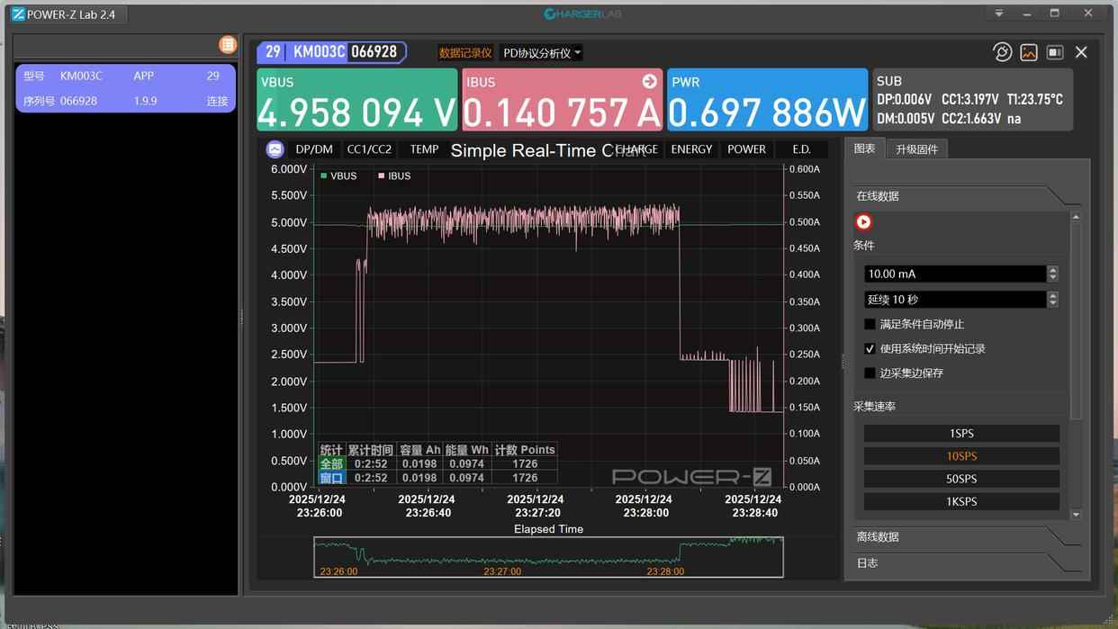 这里我使用Power-Z的KM003C功率计和附带的上位机软件,测试了6款PSSD在4种工况下的功耗表现。