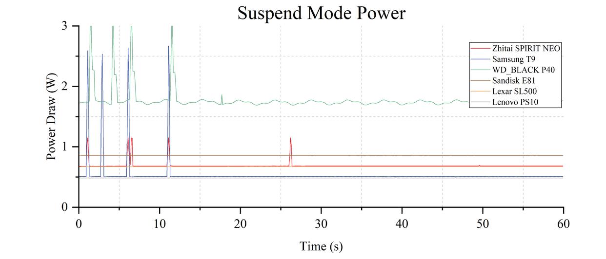 这里我记录了6款PSSD在待机状态下60s内的功耗表现,并汇总成以下曲线图: