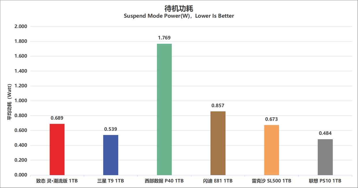 可以看到,西数P40的待机功耗达到了惊人的1.769W,而其他5款产品在待机时都只有不到1W的功耗: