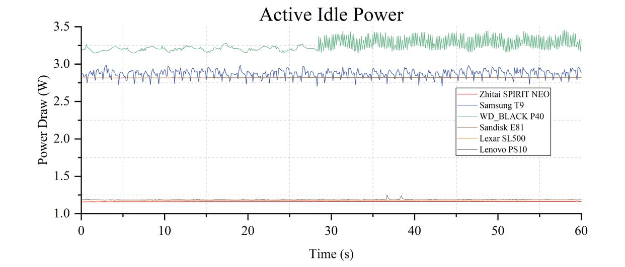 同样记录6款PSSD在该状态下的60s功耗后,可以看到三星、西数、闪迪这三款使用桥接芯片方案的PSSD明显功耗更高,在没有读写操作的情况下也超过了2.8W,而致态、雷克沙和联想在这个状态下的功耗只有不到1.2W,低功耗优势非常明显。